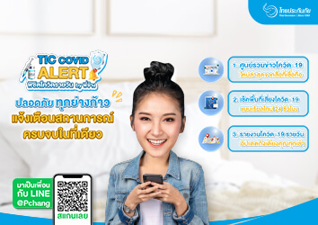 ติดตามข่าวสารและผลิตภัณฑ์ TIC ไทยประกันภัย ได้ที่ Facebook พี่ช้างไทยประกันภัย เว็บไซต์พี่ช้างออนไลน์ LINE @Pchang Call Center โทร. 02-613-0123 (ทุกวัน ตลอด 24 ชั่วโมง) หรือ แจ้งอุบัติเหตุสายด่วน โทร. 1309